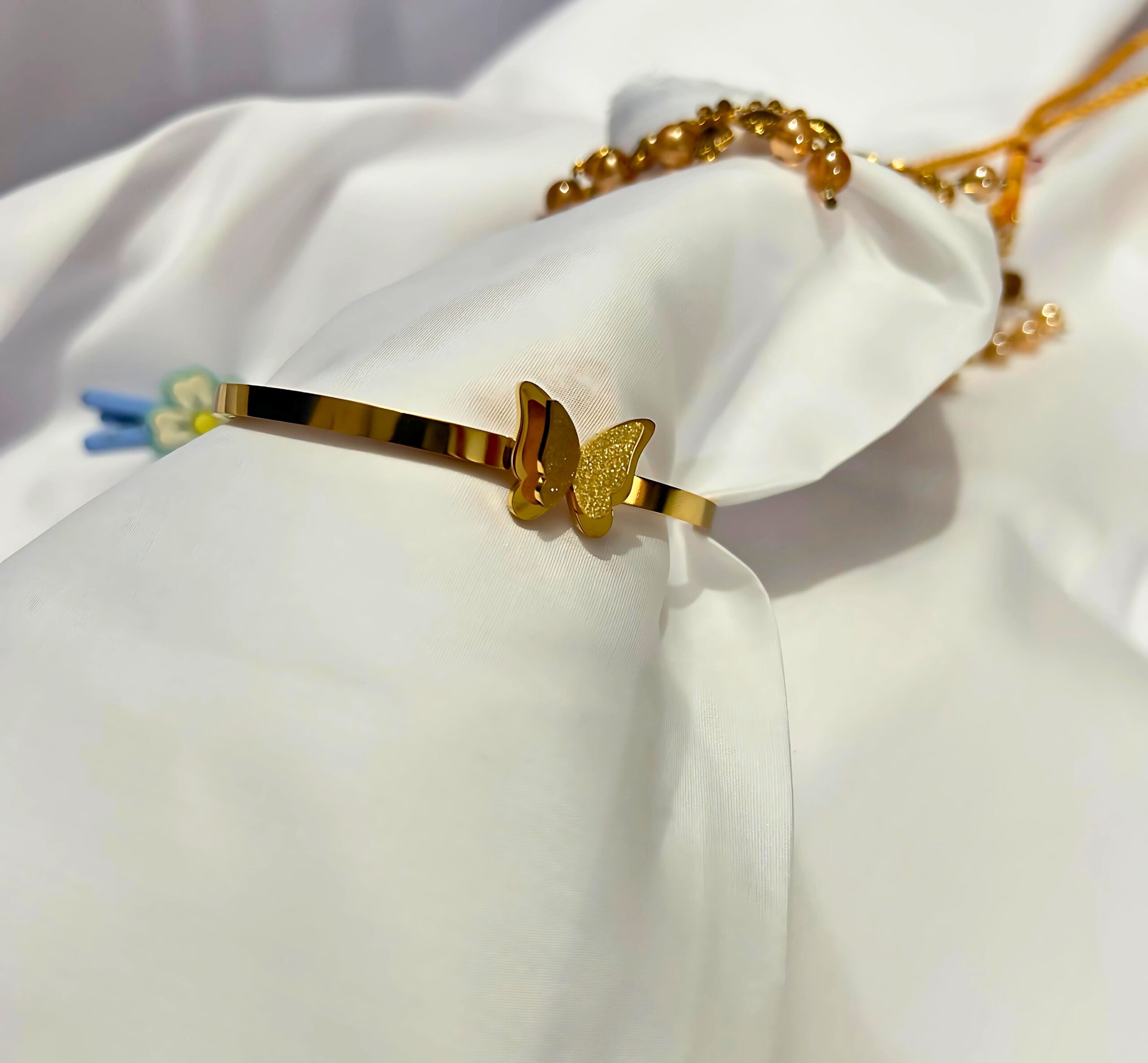 This Premium Stainless Steel Butterfly Bracelet, crafted for women and girls who love elegant, minimal jewelry with lasting shine. This  premium stainless steel butterfly bracelet features a butterfly charm that adds a soft, feminine touch — perfect for everyday wear or dressing up for special occasions. Pair this  with our Butterfly Jhumki Hooks for a complete look.