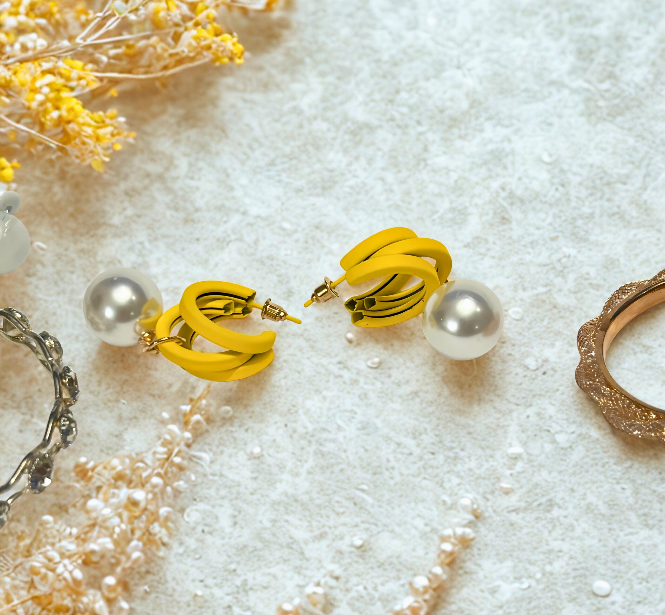 Vibrant Yellow Hoops Paired with Bold Pearl Drops