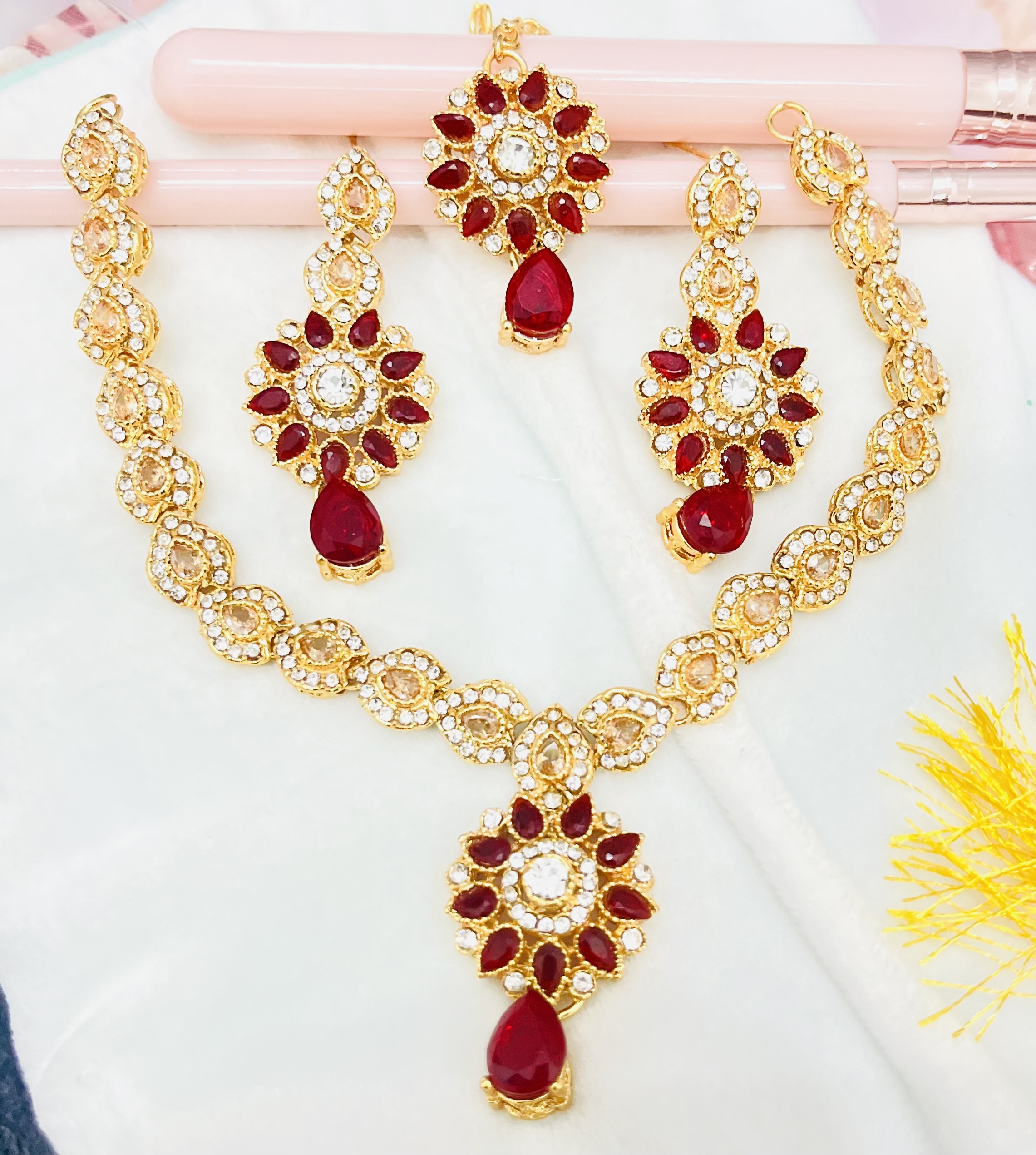 - Red Pearl Golden Wedding Necklace Jewelry Set with Earrings and Teeka